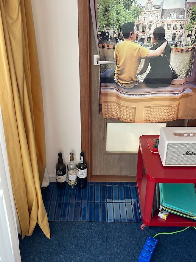 창가의 우측 공간엔 발코니로 나가는 문이 있어요. 이 문의 디자인을 좀 가리고자… 신혼 여행 가서 찍은 사진을 쉬폰 패브릭 포스터로 제작해 가리개처럼 걸어두었답니다.