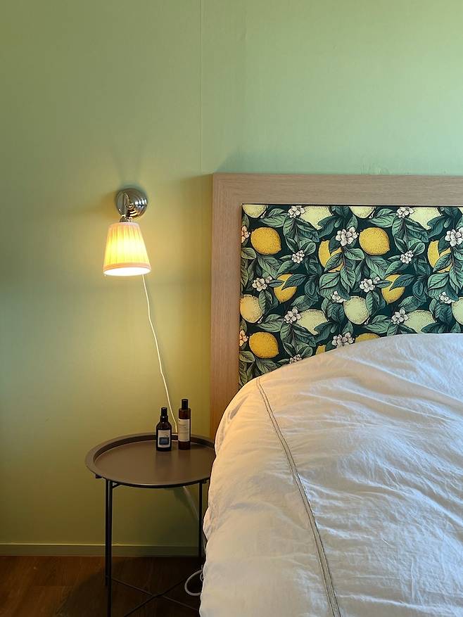 여기도 짠내나는 방법들이 여러가지 숨어있어요. 기존 벽지는 사용하고, 침대 헤드 면만 제가 좋아하는 파스텔 그린 컬러로 도배지 위에 페인트칠했어요. 그리고 침대 헤드 프레임은 목공 반장님 공사시 패브릭 쿠션을 매입할 수 있게 만들고 우드 필름으로 래핑 했어요.