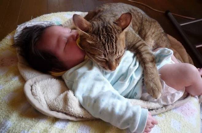 아기를 끌어안고 있는 고양이의 모습은 마치 "내가 지켜줄게", "걱정하지마. 내가 옆에 있잖아"라고 말하는 듯 보였습니다.