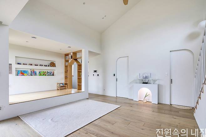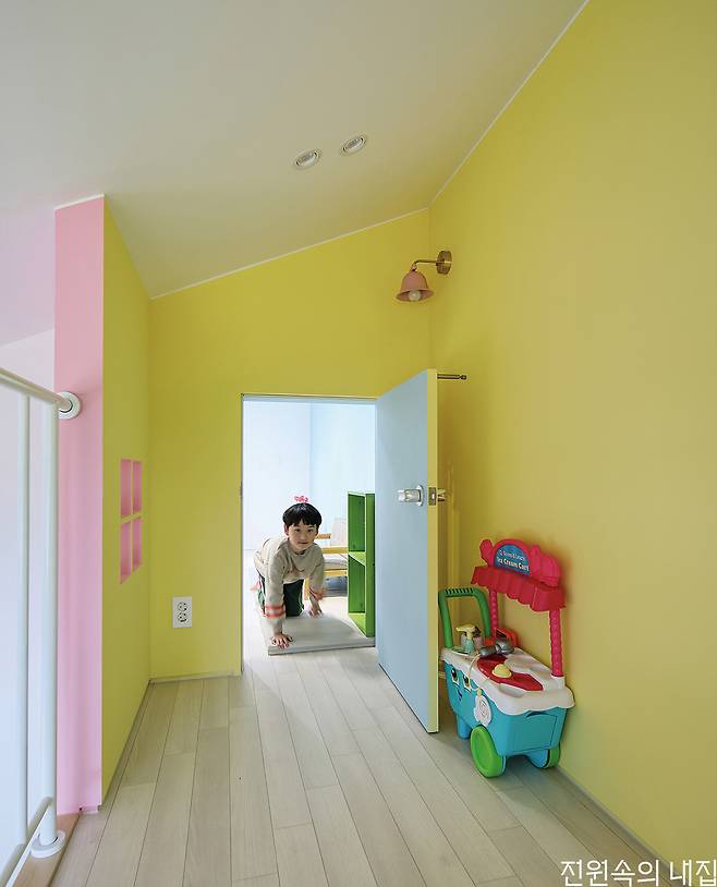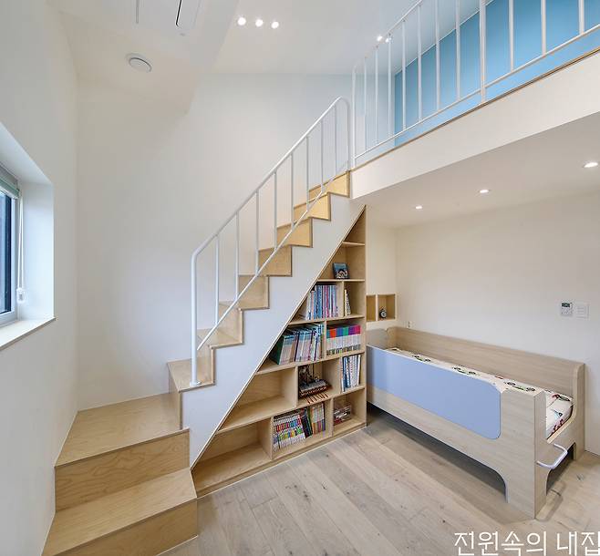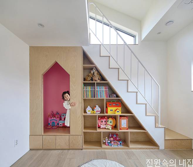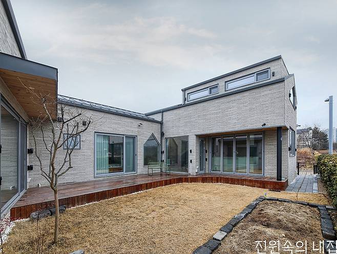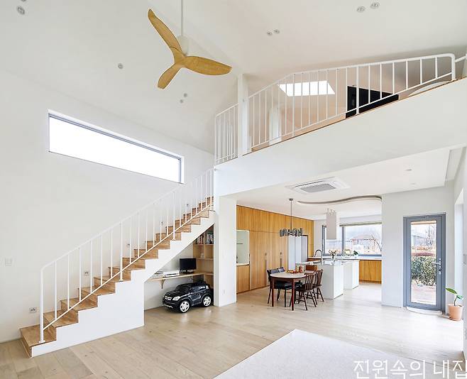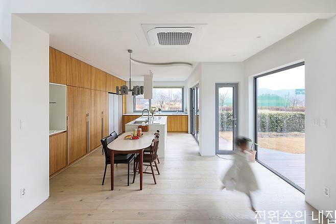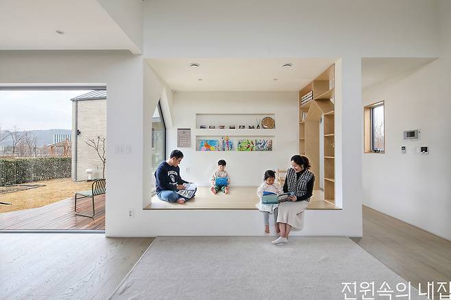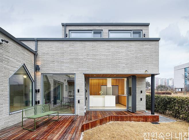 완성된 집은 아늑한 각자의 방으로 흩어지고, 보다 개방적인 북측 매스로 모이는 형태이다. 또 마당의 이점을 누리기 위해 다양한 창을 적극적으로 구성했다. 이는 공용 공간과 사적 공간 사이에 설치한 부부침실에서 각 공간으로 시야의 연결성을 높여 아직 어린 두 남매가 어디에 있든 빠르게 보살필 수 있도록 한 구성이다. 핵심 공간인 북측 공용 공간은 주방과 거실, 다락이 유기적으로 연결되는 구조다. 주방 앞에는 데크형 툇마루를 둬 아이들의 놀이 공간은 물론 계절과 날씨를 즐기며 마당생활의 로망을 충실히 실현한다.