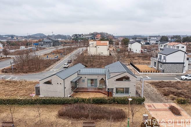 진천 혁신도시의 한 택지, 동측에 놓인 공원을 향해 양팔을 벌린 모양처럼 자리 잡은 주택. 깔끔하고 정갈한 외장과 동시에 평행하지 않고 오른쪽 매스를 좀 더 열어둔 모습이 장난스럽게 느껴지는 이곳은 네 가족의 보금자리이자 새로운 경험의 공간이다. 첫째 아들 세온이의 첫 방학을 위한 선물을 뜻하는 집의 이름 ‘여름방학’. 건축주인 임종헌·이화정 씨 부부는 이전에는 인근 지역에서 아파트 생활을 했다. 1층에 살았기에 그나마 창문을 열면 자연과 닿는 환경이었지만, 자라나는 아이들에게 방이 각각 필요해질 것을 절감하며 이사를 계획하던 차였다. 정돈된 주택 단지들을 바라보다 문득 ‘우리도 가능하지 않을까?’라는 생각이 스치며 전원주택의 계획과 로망이 차츰 자리 잡기 시작했다. 그러다 눈을 사로잡은 지금의 땅을 발견해 계약하면서 계획은 본격화되기 시작했다. 박람회를 다니며 관련 도서와 잡지를 찾아보고, 다양한 독채형 스테이에도 머물러보며 건축주로서 공간에 대한 안목과 취향을 키워나갔다.
