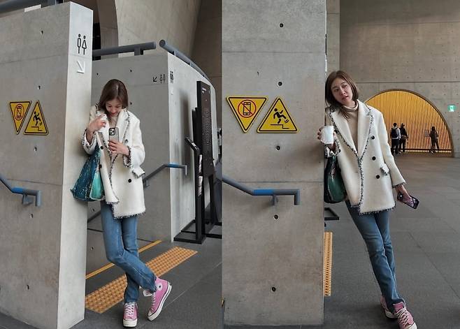 하의는 베이식한 중청 데님 팬츠로 편안함을 강조했고, 여기에 핑크 컬러 포인트의 스니커즈를 매치해 생동감과 발랄한 에너지를 더했습니다.