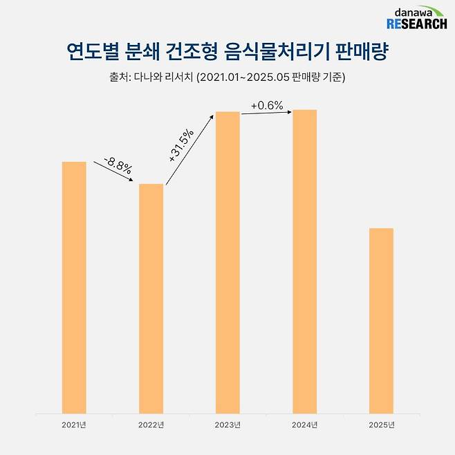 분쇄 건조형 음식물처리기의 판매량은 매년 조금씩 상승하고 있다. 2022년 살짝 주춤하기도 했지만 2023년에 30% 이상의 높은 증가율을 보이며 상승세를 탔고 2024년에도 상승 곡선을 그리는 데 성공했다.