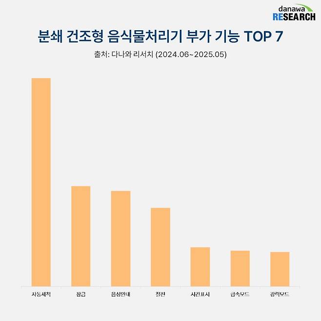 분쇄 건조형 음식물처리기에는 사용의 편의를 높이는 여러 부가 기능이 탑재되어 있다. 그중 가장 많은 제품에 적용되는 기능은 '자동 세척'이다. 자동 세척은 물을 일정량 넣어주면 원터치 버튼으로 처리기 내부의 건조통을 깨끗하게 세척하는 기능으로 벽면에 붙은 음식물 찌꺼기와 기름 때까지 큰 힘을 들이지 않고 편히 제거할 수 있다.