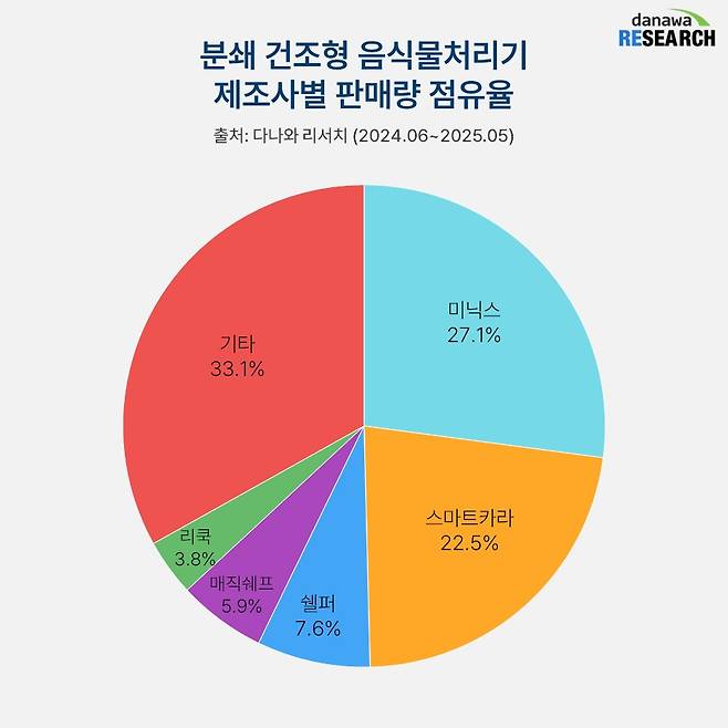 분쇄 건조형 음식물처리기 시장에서 최근 1년간 소비자들의 선택을 가장 많이 받은 제조사는 미닉스다.