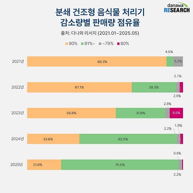 분쇄 건조형 음식물처리기에 음식물 쓰레기를 넣으면 얼마나 줄어들까. 2021년에는 10대 중 9대에 가까운 제품이 90% 감소량을 보였다. 2022년에는 10대 중 6대로 큰 하락세를 기록했는데 이는 기술의 발전으로 91% 이상을 감소시키는 제품이 등장했기 때문이다.