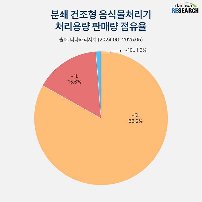 최근 1년간 거래된 분쇄 건조형 음식물처리기의 용량은 5L 이하의 제품이 대부분이다. 1인 가구의 증가로 1L 이하의 제품도 약 15%이라는 적지 않은 점유율을 가져갔다.
