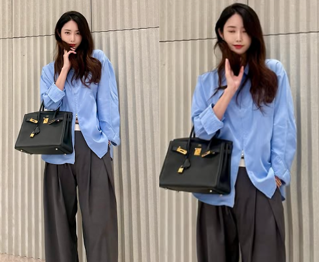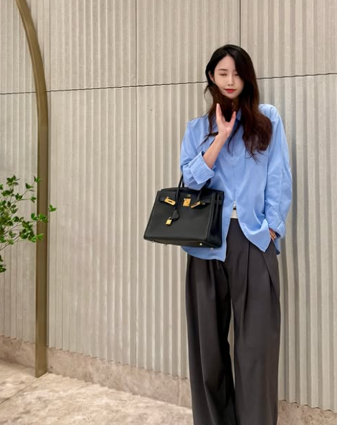 정주연은 오피스룩 스타일로 깔끔하면서 세련된 룩을 완성했습니다. 블루 셔츠는 깔끔한 라인으로 그녀의 우아한 매력을 더욱 돋보이게 했고, 와이드 그레이 슬랙스 팬츠는 편안하면서도 스타일리시한 분위기를 자아냈습니다. 여기에 고급스러운 블랙 에르메스 핸드백을 매치하여 전체적으로 세련되면서도 고급스러운 느낌을 강조했습니다.