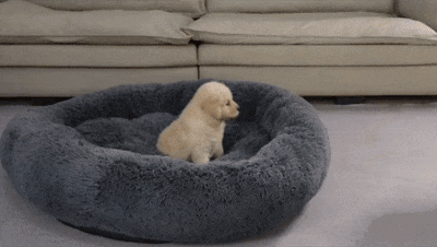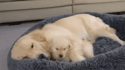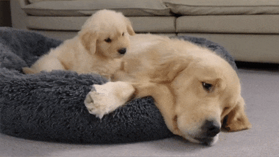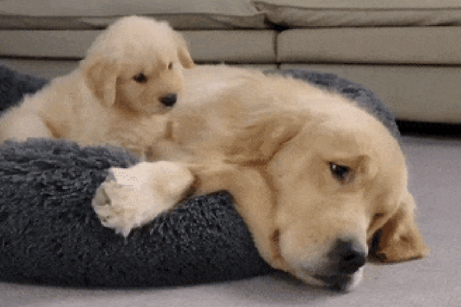 골든 리트리버의 범퍼 침대를 새끼 강아지가 차지하고 놀고 있었습니다. 그때 어미 골든 리트리버가 침대에 들어오자 새끼 강아지가 깜짝 놀랐습니다!