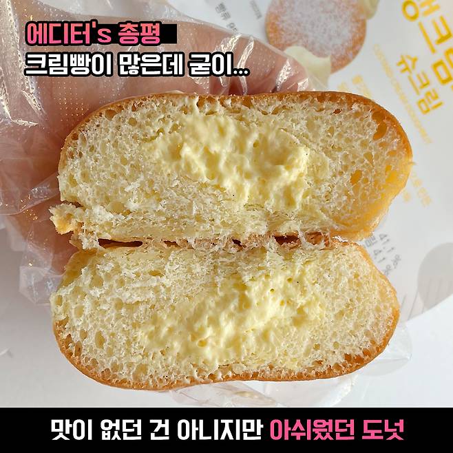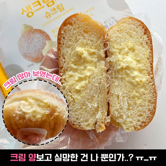 겉 부분에 크림 튀어나온 거 보고 기대했던 제 잘못일까요? 크림이 많이 들어있을 거란 생각을 했는데 보기에도 빵 부분이 가득한..