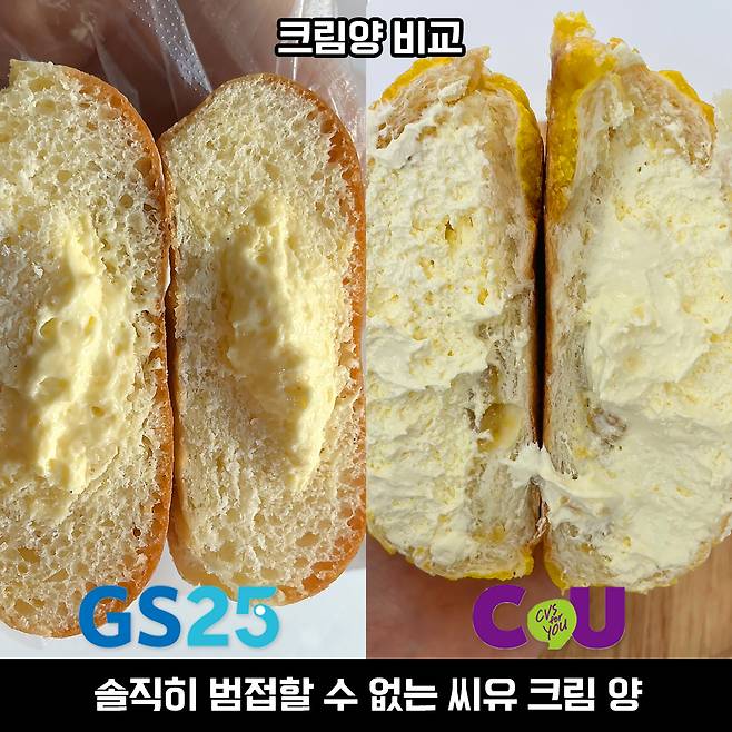 사실 제일 생크림도넛을 리뷰하면서 제일 궁금했던 것이 크림양이었어요~ 그래서 밥심이 CU연세우유 크림빵과 크림양을 비교해봤는데 결과는 이렇습니다..