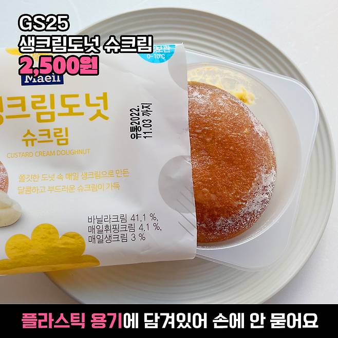 가격은 편의점 도넛이라 그런지 좀 저렴한 느낌이었어요. 플라스틱 용기에 담겨있어서 손에 안 묻고 꺼낼 수 있다는 장점~ 저기 보면 이미 크림이 묻어있는 거 보이죠? 플라스틱 용기 덕분에 도넛 모양도 망가지지 않고 예쁘게 보관되어 있답니다:)