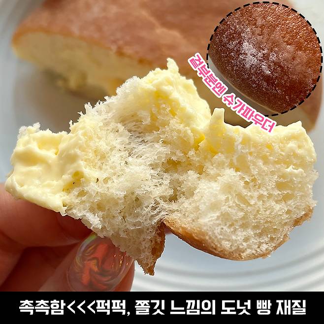 빵을 손으로 찢고 눈으로 확인해봤을 땐 촉촉하진 않고 약간 퍽퍽한 재질인 것 같았어요. 봉지에도 적혀있듯이 쫄깃한 도넛이라고 하네용ㅎㅎ 촉촉함보단 퍽퍽, 쫄깃한 식감을 가진 생크림도넛 이랍니다!