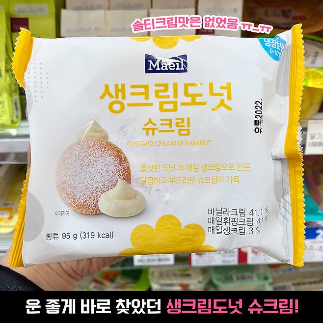 생크림도넛은 총 2가지 종류로 나왔어요. 슈크림이랑 솔티크림 맛! 그런데 이게 몇 군데 돌아다녔는데도 솔티크림 맛은 구하기 어려웠어요ㅠㅠ 그래서 뭔가 더 궁금한 거 있죠? 슈크림은 운 좋게 첫 번째 방문했던 편의점에 있었어요. 오늘의 리뷰는 너로 정했다!
