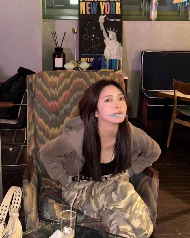 최규리는 블랙 탱크톱과 카키색 크롭 후디 재킷을 걸치고 강렬한 레터링이 들어간 카모 팬츠를 매치했다. 상의를 단순하게 두고 하의에 포인트를 둔 조합으로 트렌디한 무드를 완성했다. 터프한 아이템이지만 밝은 표정과 대비돼 더 매력적으로 보였다. 데일리룩으로 활용한다면 티셔츠와 후디 조합에 카모 팬츠 하나만 더해도 충분하다.