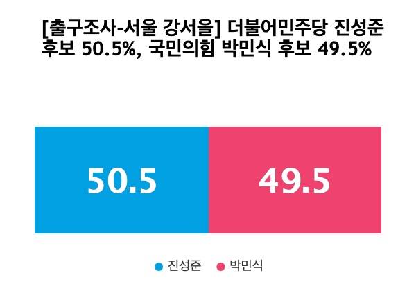 4.10 총선 지상파 방송3사 출구조사 결과, 서울 강서을 선거구에서 더불어민주당 진성준 후보 50.5%, 국민의힘 박민식 후보 49.5%로 나타났다.