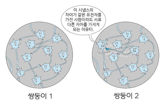 일란성 쌍둥이가 있을 때 두 사람은 미토콘드리아를 제외하고는 유전적 구성이 거의 동일하다. 즉 동일한 세포핵을 소유하므로 같은 염색체 세트를 갖는다. 그러므로 얼굴 생김새나 신체의 구조와 형태가 구분이 안될 정도로 매우 닮아 있다. 쌍둥이의 뇌 역시 동일할까? 정답은 ‘아니다’이다. 쌍둥이는 태어난 이후에 겪어 나가는 세상 경험이 각자 다를 수밖에 없다. 따라서 경험하는 내용이 다르게 되고 뇌로 입력되는 정보가 다르다. 결과적으로 정보를 처리하는 뇌 신경회로의 종류와 구성이 다를 수밖에 없다. 활성화돼 변화하는 시냅스의 종류가 달라지게 되고, 시냅스 수준에서 뇌의 구조도 다르게 변화한다.
