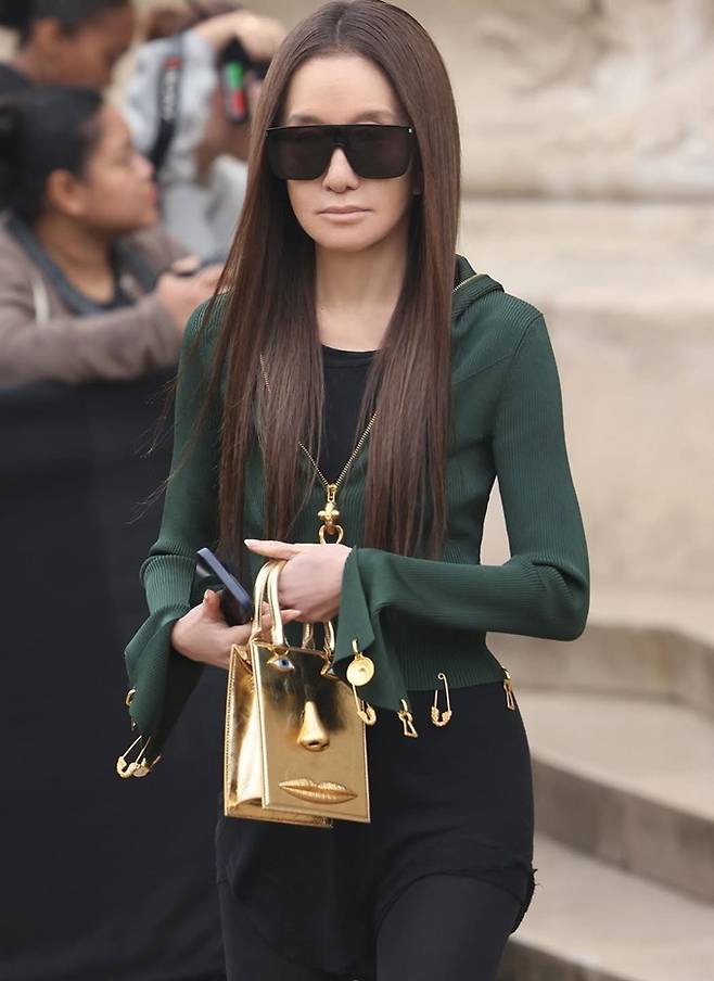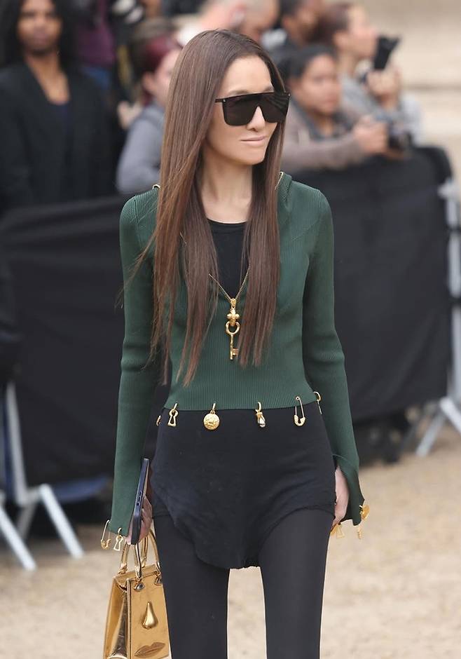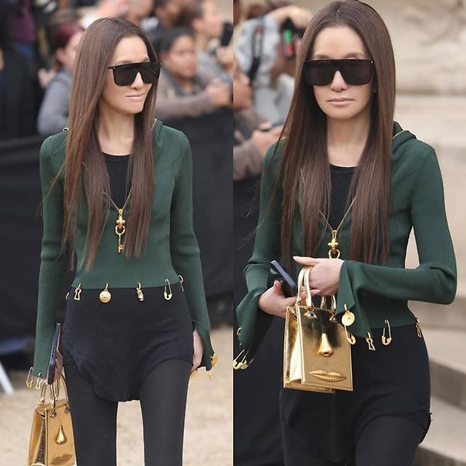 니트 곳곳에는 골드 참과 핀 디테일이 장식되어 있어 그녀 특유의 ‘펑크 시크’ 감성을 세련되게 드러냈으며, 바디라인을 강조하는 실루엣과 과감한 컷아웃은 여전히 도전적인 그녀의 철학을 반영했다.