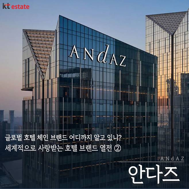 금일은 전 세계 호텔 브랜드 중 하얏트의 럭셔리 라이프스타일 브랜드인 ‘안다즈’에 관해 알아봤습니다. 안다즈의 호텔들은 현지화를 적용해 전 세계 어디서든 조화를 이루며, 예술적 영감을 제공하는 공간으로 기존 호텔과는 차별화를 이룬 모습을 볼 수 있는데요. 그중 안다즈 서울 강남은 우리나라 조각보를 활용한 독창적인 디자인과 하얏트 특유의 세련된 서비스로 호평을 얻고 있습니다. 앞으로 호텔 브랜드 스토리에서는 전 세계 유명 호텔 브랜드를 소개해 드릴 테니 다음 편도 기대해 주세요!