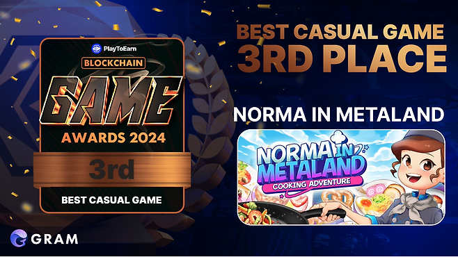 그램퍼스의 블록체인 전문 자회사인 그램퍼스 씨더블유씨(GRAMPUS CWC)가 서비스 중인 웹3 요리 시뮬레이션 게임 ‘노마 인 메타랜드(Norma in Metaland)’가 최근 PlayToEarn에서 개최한 Blockchain Game Awards 2024 베스트 캐주얼 게임 부문 3위에 선정되었다.
