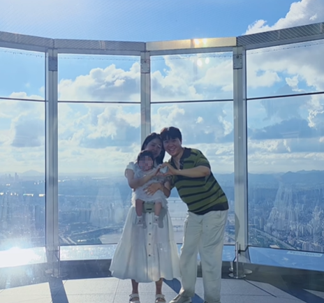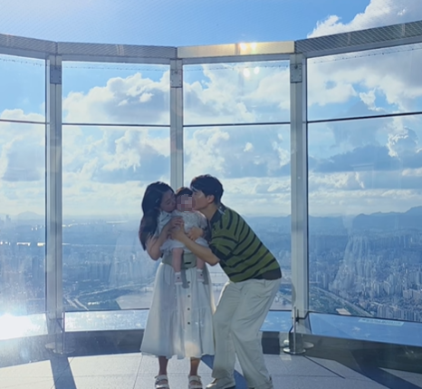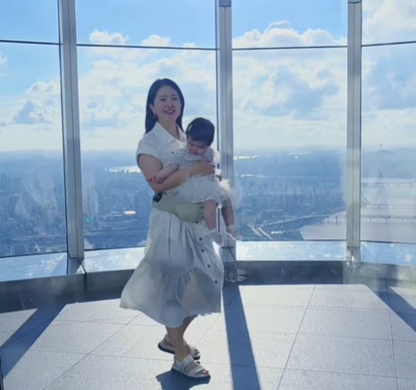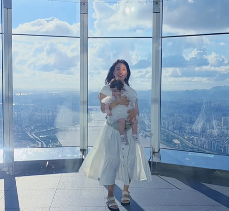 전망대에서 촬영된 가족 나들이 영상 속 김다예는 흰색 원피스와 샌들을 착용한 채 10개월 된 딸 재이를 품에 안고 있다.