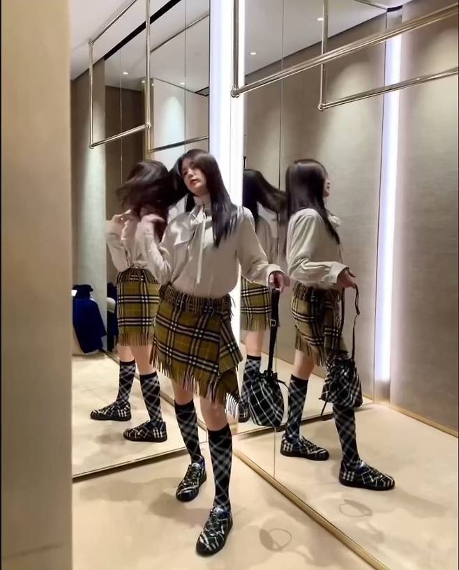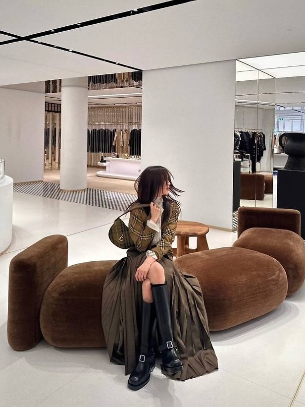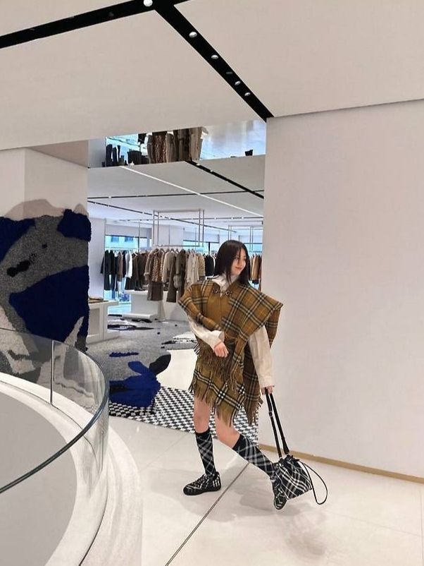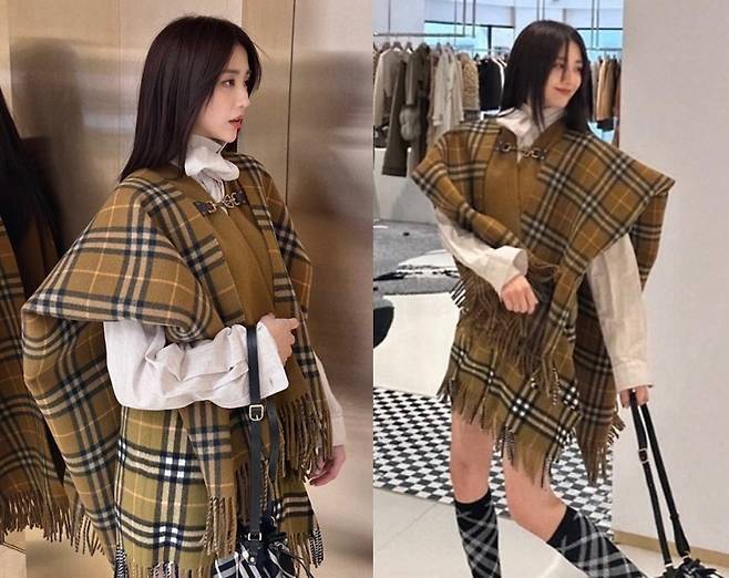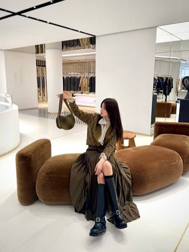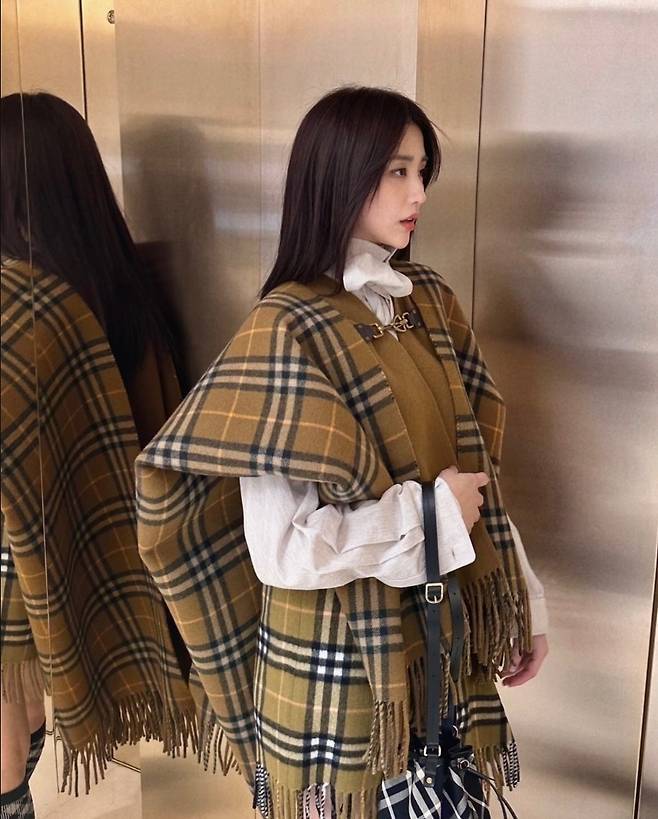 박하선은 브라운과 카키 톤이 돋보이는 체크 블레이저와 프린지 디테일이 매력적인 스커트를 매치했습니다.