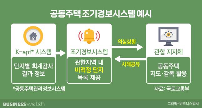국토부는 조기경보시스템을 통해 선제적으로 이상징후를 파악해 지도·감독할 수 있다고 설명했다. 아울러 지자체의 지도·감독을 적극적으로 지원하기 위해 향후 이상징후를 지자체에 별도로 안내할 예정이다. 지자체는 공동주택에 감사를 실시할 수 있으며 감독을 위해 필요한 경우에는 명령을 할 수 있고 공동주택법령 위반사항이 있을 경우 과태료를 부과할 수 있다.
