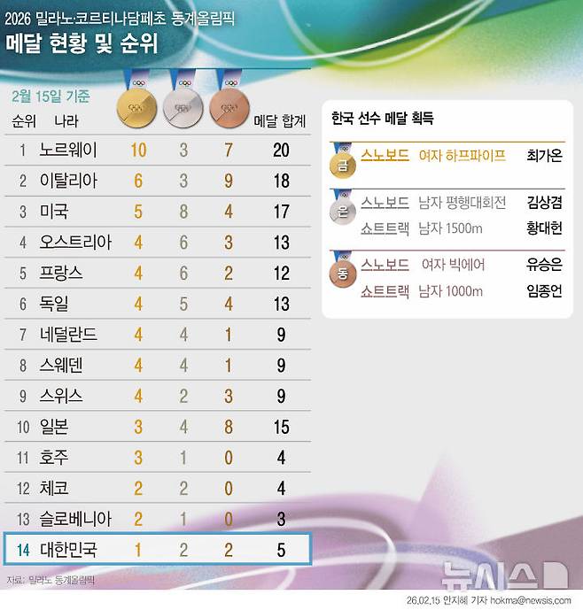 [그래픽] 밀라노 동계올림픽 메달 순위 (15일)