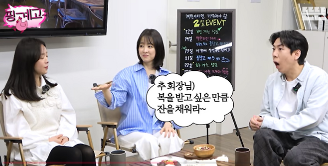 박보영은 “‘아니요 언니! 저 복 많이 받고 싶습니다’라고 했다”면서 잔에 술을 더 따르는 시늉을 했고, 양세찬은 “성격이 시원시원하시다”라고 놀라움을 표했다.