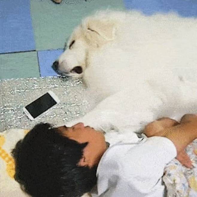 사이좋게 나란히 누워서 잠을 청하려고 하는 아이와 강아지가 있습니다. 강아지는 당연하다는 듯이 아이 옆에 껌딱지처럼 찰싹 붙어 누워 있었는데요.