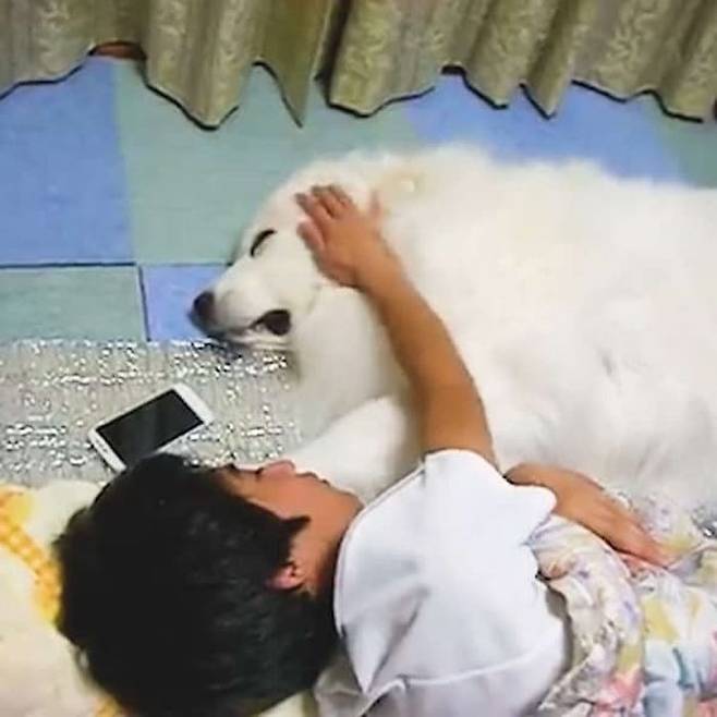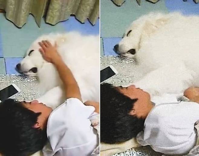 잠자는 순간에도 서로 티격태격하는 아이와 강아지 모습이 보는 이들로 하여금 흐뭇하게 합니다.
