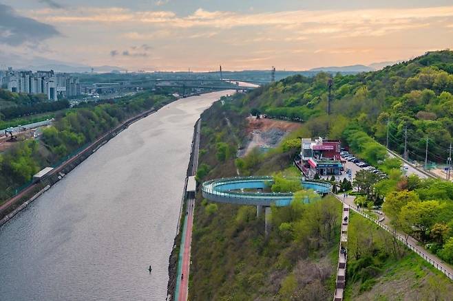 계양산 협곡 구간에 자리한 지름 46m의 원형 전망대인 아라전망대는 계단 없이도 웅장한 풍경을 감상할 수 있다는 것이 큰 장점인 장소입니다.