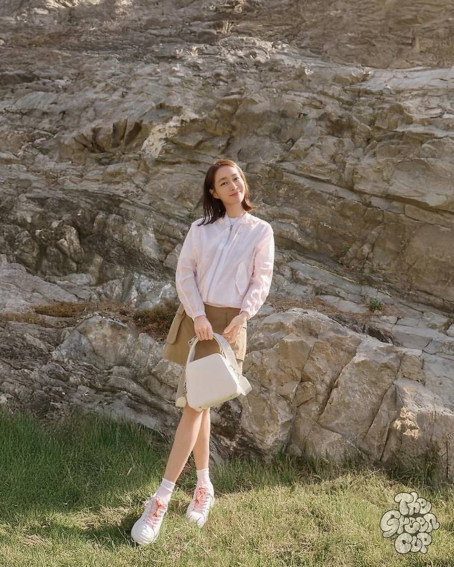 두 번째 사진에서는 화이트 셔츠와 베이지 컬러 미니스커트로 깔끔한 캐주얼 스타일을 완성했다. 크림 컬러 핸드백과 화이트 스니커즈의 조합으로 편안하면서도 트렌디한 무드를 자아내고 있으며, 자연스러운 헤어스타일이 전체적인 내추럴 룩의 완성도를 높이고 있다.