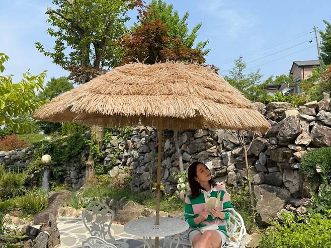 마지막 사진에서는 그린과 화이트 스트라이프 원피스로 상쾌한 여름 분위기를 표현하고 있다. 짚으로 만든 파라솔 아래에서 책을 읽는 모습이 여유로운 휴가 무드를 완벽하게 연출하며, 자연스러운 컬러 조합이 리조트 패션의 정수를 보여주고 있다.