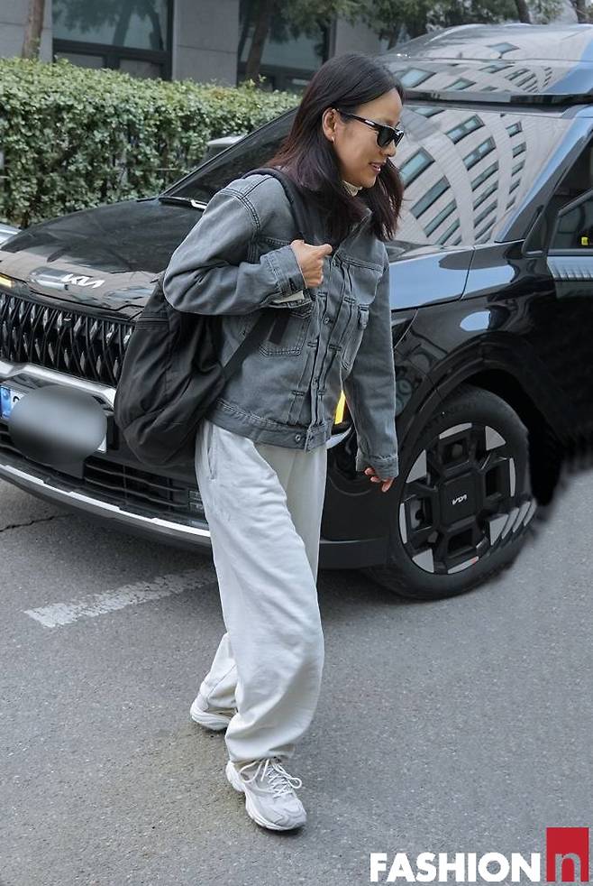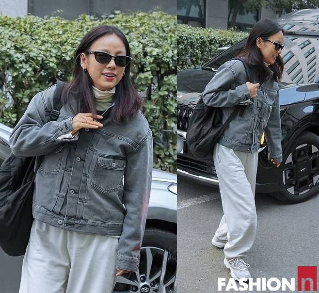 이날 이효리는 스웻 팬츠와 데님 팬츠를 매치한 소박한 일상룩으로 힙하면서도 스웨그 넘치는 출근룩을 연출했다.