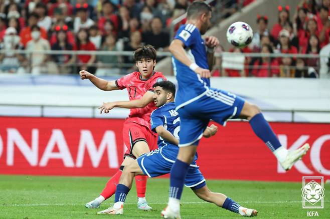몸상태가 정상이 아닌 손흥민을 대신해 왼쪽 윙으로 선발로 나선 배준호는 전반 11분 설영우의 크로스를 헤더로 연결해 골대를 맞췄다. 전반 18분에는 이강인의 패스를 받아 간결한 슈팅으로 쿠웨이트를 위협했다.