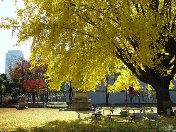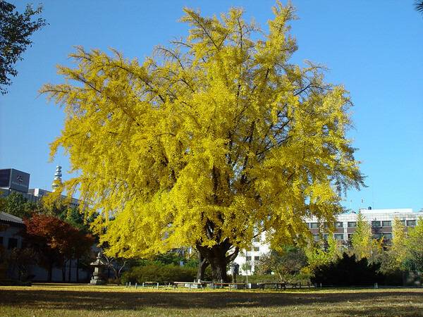 가을을 노랗게 만드는 건 생강나무나 히어리도 있지만 주연급은 단연코 은행나무다. 엄청난 크기의 문막 반계리 은행나무도 생각난다. 씨앗이 떨어져 싹이 난 실생묘가 자연스레 번식되기도 한다. 암컷 수컷 나무가 다른 '자웅이주'라 가로수로는 열매가 열리지 않는 숫그루를 선호된다.