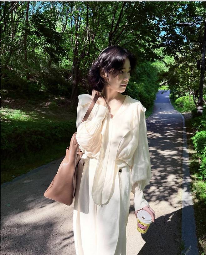 커피 한 잔을 들고 꽃길과 숲길을 거니는 모습은 마치 한 편의 영화 속 한 장면 같았고, 짧은 웨이브 단발과 미소는 봄 햇살보다도 따뜻했습니다.