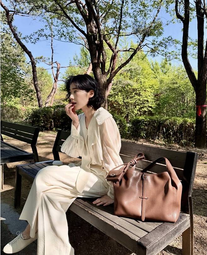 고운 주름이 잡힌 아이보리 셋업에 브라운 빅 숄더백을 매치한 정은채는 부드럽고 여유로운 무드를 고스란히 담아냈습니다.