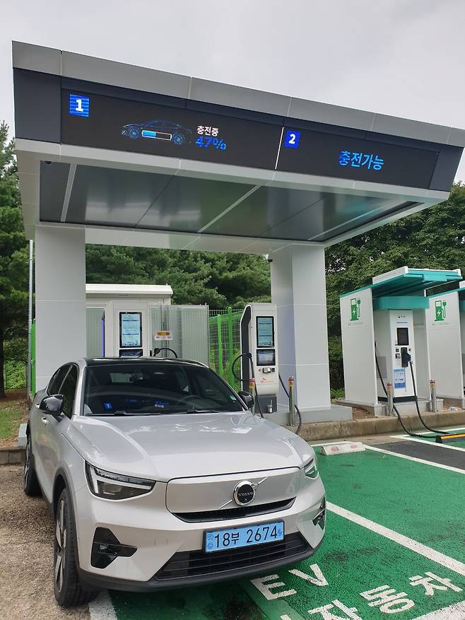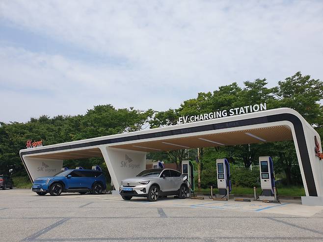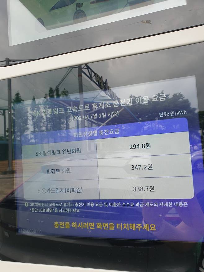 도착 후 확인한 충전기는 SK 일렉링크 제품으로 충전속도는 200kW와 350kW 두 종류다. 충전요금은 회원 294.8원/kWh, 비회원 338.7원/kWh이다. 큰 차이는 없었지만 앱을 깔고 충전을 해보기로 했다. 앱을 깔고 회원가입을 위한 인증 등 시간이 지나갔고, 80% 설정 후 충전까지 총 30여 분을 충전소에서 시간을 보냈다.