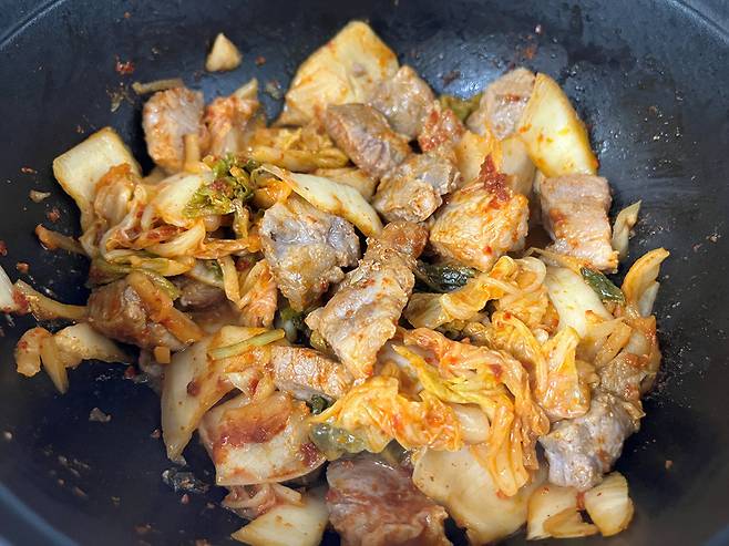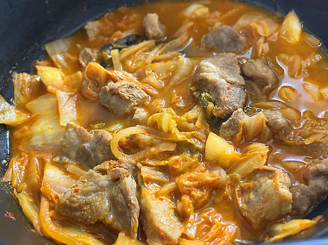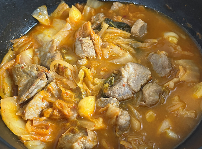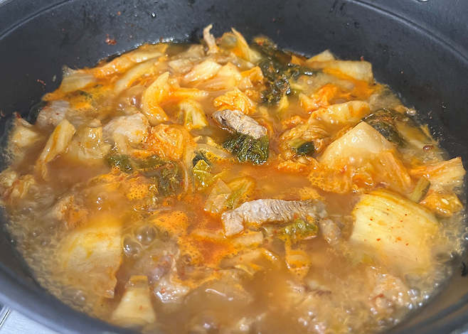 구수한 돼지고기와 김치의 조합이 너무 좋습니다. 쌀뜨물을 넣어 국물도 깊고 진한 돼지 김치찌개가 완성됩니다.