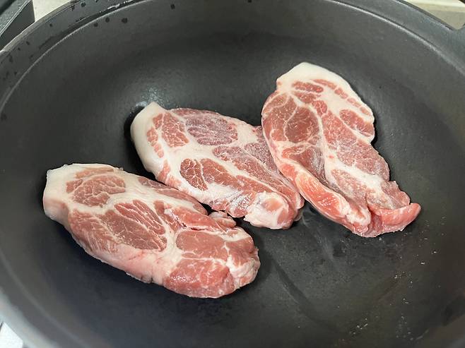 돼지고기 겉면이 노릇해질 때까지 구워 주세요. 찌개에 적당한 부위는 앞다리살, 목살 등이 있습니다.