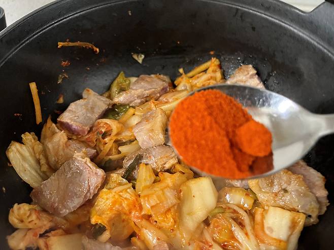 고춧가루 약 1스푼 넣어 주세요. 김치 자체가 붉다면 1/2스푼만 넣으세요.