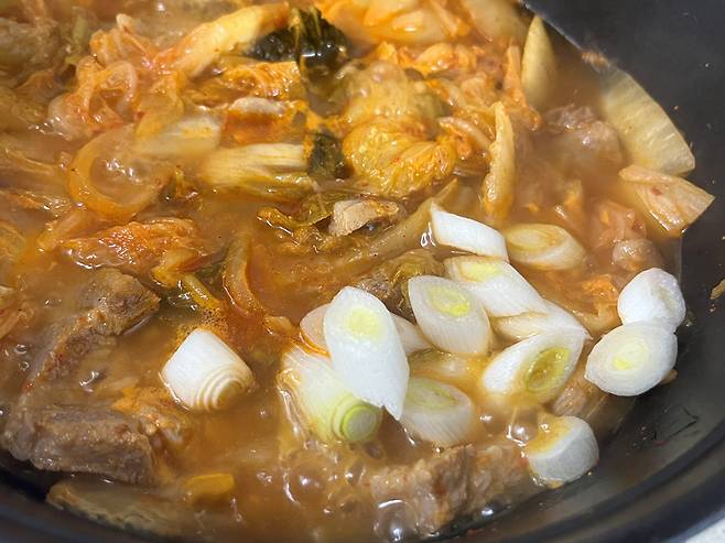 고기가 푹 익으면 대파를 넣어서 1~2분만 더 끓입니다. 국물이 살짝 걸쭉해질 정도로 끓이세요.