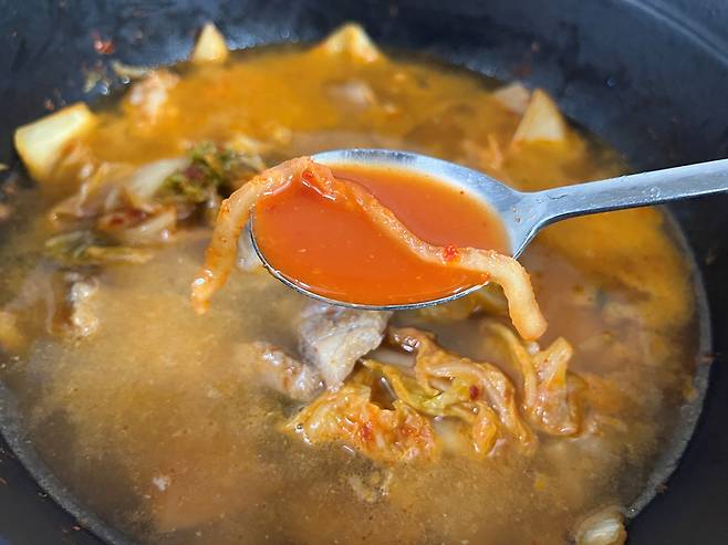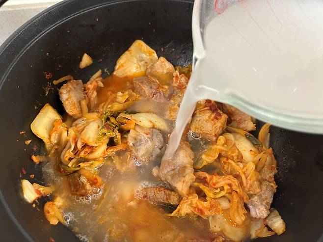 다른 양념 넣지 않고 오로지 김치 국물로만 간을 합니다. 김치 국물을 3스푼 정도 넣으세요. 양은 기호에 따라 조절하세요.