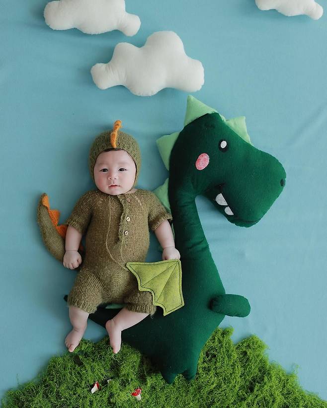 또 다른 사진에서는 공룡 인형 등에 올라타 귀여운 '꼬마 공룡'으로 변신한 모습도 포착됐다. 아빠 잘생김과 엄마 인형미를 절묘하게 반반 닮은 하루는 네티즌 사이에서 천상계 미남, 비현실적인 50일차 라는 반응을 끌어냈다.
