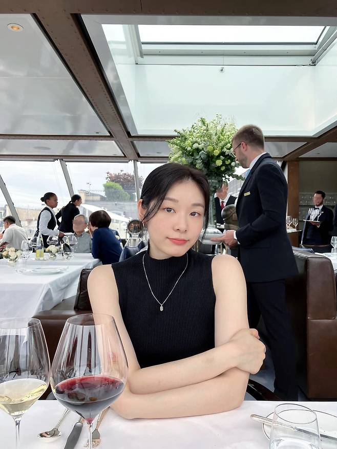 깔끔하게 묶은 머리와 군더더기 없는 액세서리, 그리고 포도주 잔을 앞에 둔 정적인 구도가 그녀를 더욱 단단하게 보여줘요.