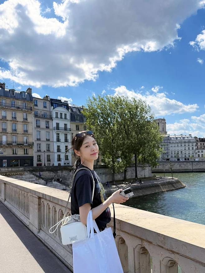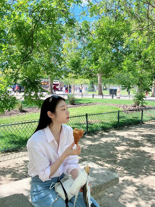 루브르 근처에서 지도를 들고 앉아 있는 순간에도, 셔츠와 데님만으로 단정하면서도 깔끔한 무드를 완성했어요.