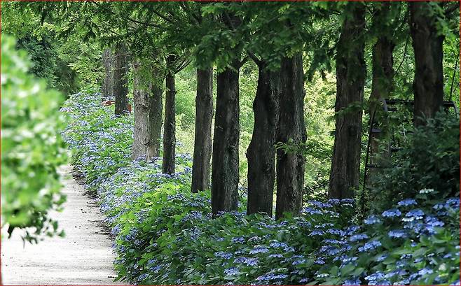 정원 곳곳을 채우고 있는 수국은 6월 말부터 7월 중순까지 절정을 맞이하며,메타세쿼이아 길을 따라 정원을 걸으면 파스텔톤의 보랏빛, 핑크빛, 연보랏빛 꽃송이들이 길을 안내하듯 피어납니다.
