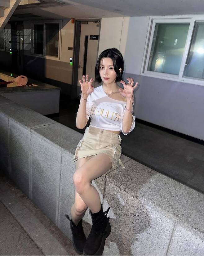 화이트 오프숄더 크롭 티셔츠에 베이지 컬러 미니스커트를 매치해 상큼하면서도 섹시한 무드를 연출했고, 블랙 워커로 마무리해 스트리트 감성을 제대로 살렸습니다.